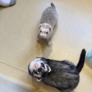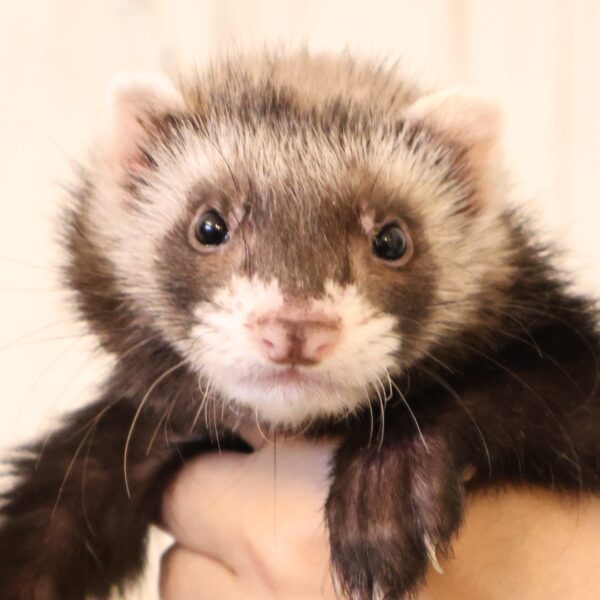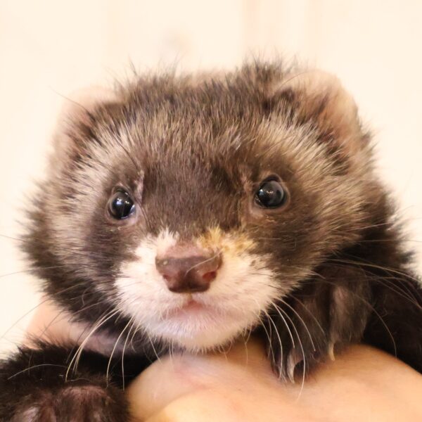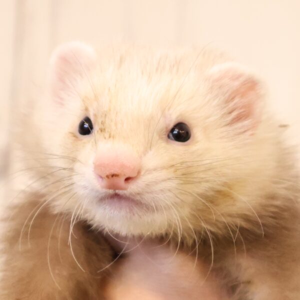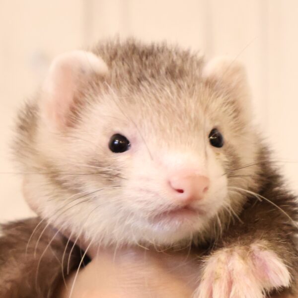 特有の匂いはありますが、食事と寝具管理で大きく軽減できます。当店のマーシャルフェレットは臭腺除去済みのため、一般に言われるほど強い匂いではありません。