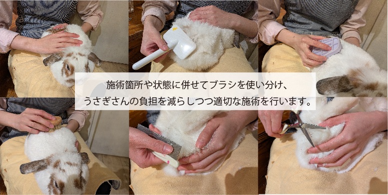 その子の状態に応じて手を使ったハンドグルーミングとコーム、スリッカーブラシ、ラバーブラシ、豚毛ブラシなどを使い分けて、うさぎさんに負担をかけない施術を行います。