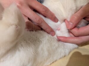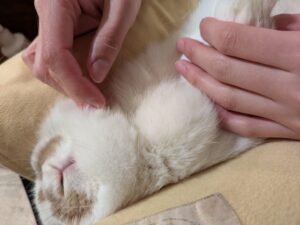 ※高齢や緑内障、エンセファリトゾーン症による後遺症などで、ひっくり返し抱っこが負担になる子は、保定の方法を変えますので、ご心配があれば遠慮なくご相談ください。