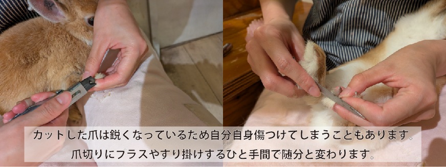 爪をカットしただけでは、切断面が鋭角になっているため、うさぎ自身がセルフグルーミングの際に自分の身体を傷つけてしまうリスクがあるためです。