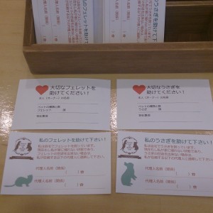 当店ではオープン以来、「命をつなぐカード」を無料で配布しております。 「命をつなぐカード」は、外出時にオーナー様ご自身の身に万が一の緊急事態が生じた際、お家でお留守番をしているフェレットやうさぎを守るためのカードです。 東日本大震災では多くのペットも被災しました。 その中には震災を生き延びた後、救助が間に合わずに亡くなった命も多数に上ります。 その教訓から生まれたのが「命をつなぐカード」で...