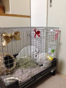 ケージにたくさんのリボンを飾ってもらったそうです。